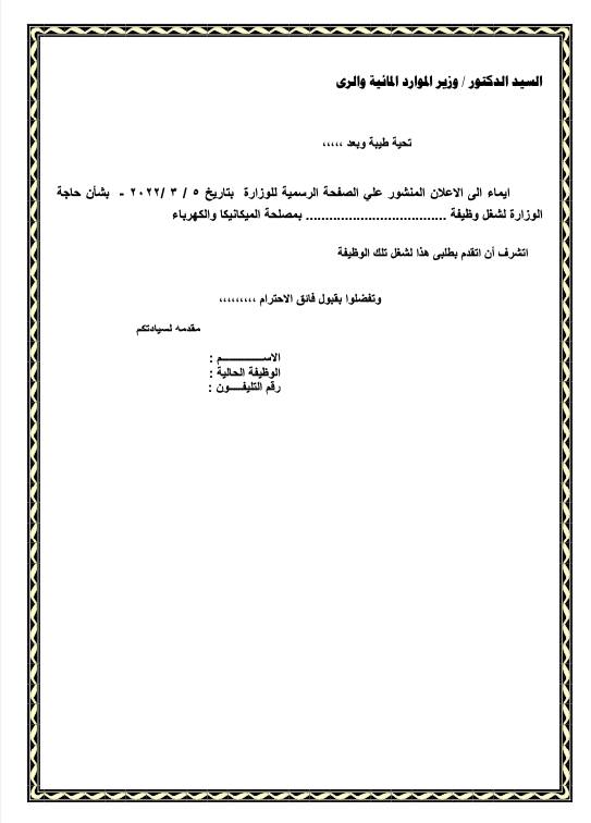 وأكدت وزارة الري، أنه يجب تقديم الطلب، والسيرة الذاتية لجميع المتقدمين بالإضافة إلى بيان حالة وظيفية حديث من الجهة الأصلية للمتقدمين شاغلي وظيفة كبير، والمستوى الأول 1، موضحا به موقف الجزاءات والإحالة للمحاكمة التأديبية أو الجنائية، إلكترونيا من خلال إرساله بملف واحد بصيغة pdf للإدارة المركزية للموارد البشرية بالديوان العام على الواتس رقم 01126590723.