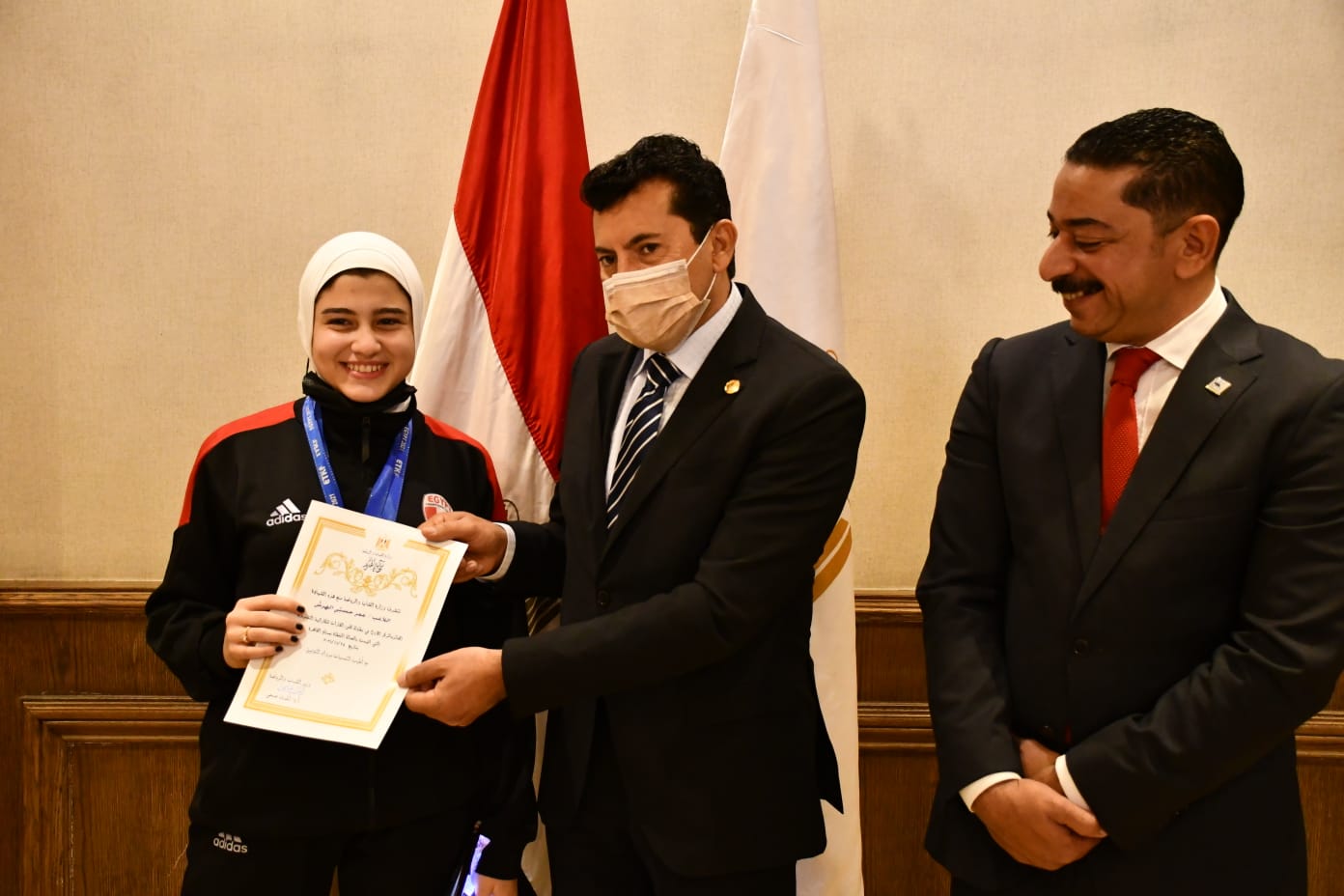 ووزع الدكتور أشرف صبحي، شهادات التقدير على اللاعبين واللاعبات، الفائزين بذهبية منافسات كأس القارات للكاراتيه التقليدي.
