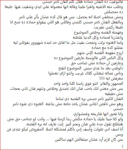 واختتم حديثه: دلوقتي بعد ما عدى سنين الموضوع اتفتح، وناس عمالة تبعتلي كلام غريب وأنتو ازاي تعملوا معرفش إيه، الجمهور والفانز أنتو فوق راسنا كلنا واحد واحد، بس مش معنى أنك بتحب فنان أنك تصدق وخلاص وتتهم فنان تاني بحاجات مش حقيقية، الفنان الكبير تامر حسني برة القصة دي تمامًا، وهو مش ناقص أغاني عشان ياخد حاجة مش بتاعته، الغنوة دي غنوة تامر حسني، وأنا فخور أنها في تاريخه وفي مشواري، ولو كنا جينا عليك يا حمادة مكنش ربنا كرمنا فيها، وأنت لو صاحب حق مش هتطلع تقول كدة على فنان ونجم كبير إنت عارف إنه برة القصة، أنا آسف إني طولت وآسف إني بتكلم فمشكلة اصلًا المفروض ليكو عندى فن وبس، كان لازم أرد عشان ميتقالش إنهم ساكتين.