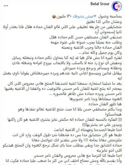 وكتب بلال سرور، عبر حسابه الشخصي بموقع فيس بوك: بمناسبة وصول أغنية عيش بشوقك 130 مليون، وعشان جالي كذا تعليق، متضايقين من طريقه تعليقي على اللي قالو الفنان حماده هلال، فأنا بعتذر أولًا وثانيًا اسمحولي أرد، صديقي الفنان مصطفى حسن، كلم حمادة هلال، وطلب منه يجيلنا يجرب صوته على غنوة مهمة، حمادة جالنا وجرب الأغنية وعجبته، وكان يوم جميل وكله تمام.