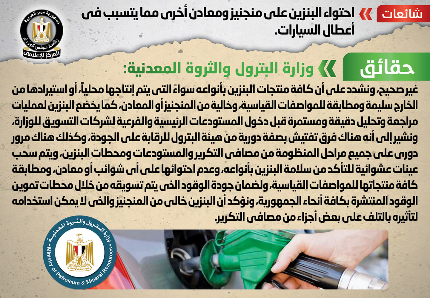 وأكدت وزارة البترول والثروة المعدنية، أنه لا صحة لاحتواء البنزين على منجنيز أو أي معادن، مُشددةً على أن كافة منتجات البنزين بأنواعه، سواءً التي يتم إنتاجها محليا، أو استيرادها من الخارج سليمة ومطابقة للمواصفات القياسية، وخالية من المنجنيز أو المعادن، كما يخضع البنزين لعمليات مراجعة وتحليل دقيقة ومستمرة قبل دخول المستودعات الرئيسية والفرعية، لشركات التسويق للوزارة.
