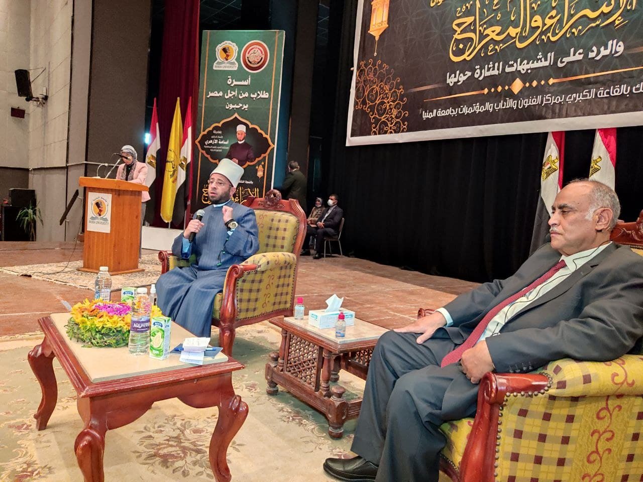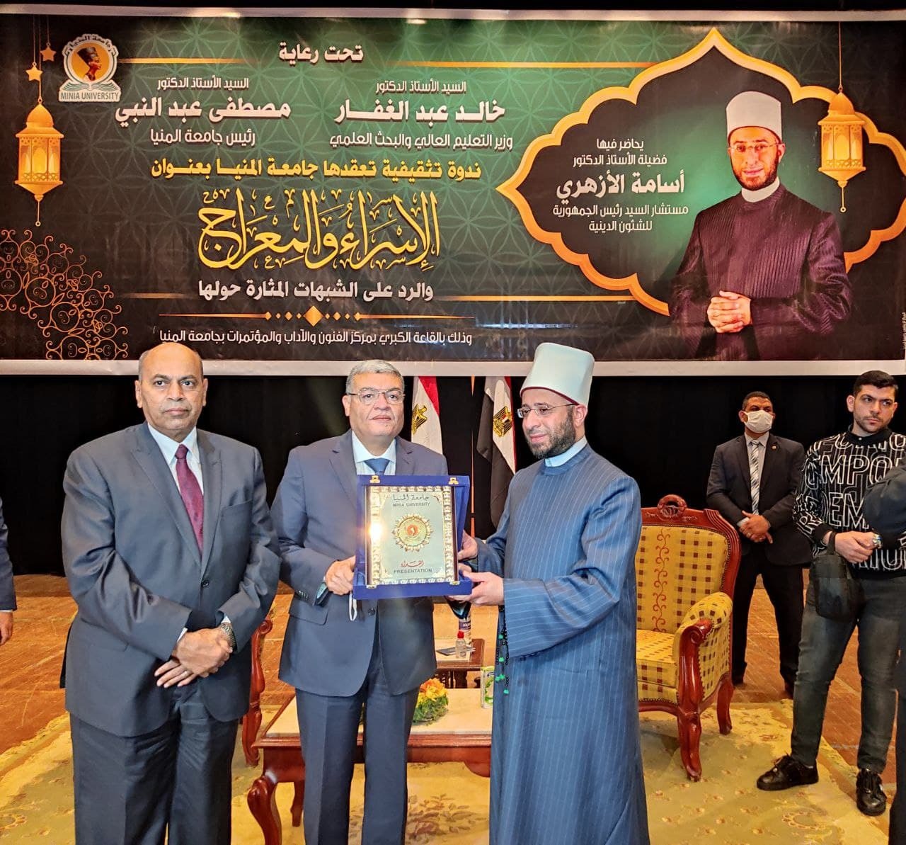 واستضافت جامعة المنيا الدكتور أسامة الأزهري، اليوم الأحد، وكان في استقباله الدكتور مصطفى عبد النبي، رئيس الجامعة، ونواب رئيس الجامعة، بحضور اللواء أسامة القاضي محافظ المنيا، على هامش محاضرة ألقاها بعنوان: الإسراء والمعراج.. والرد على الشبهات المثارة حولها.