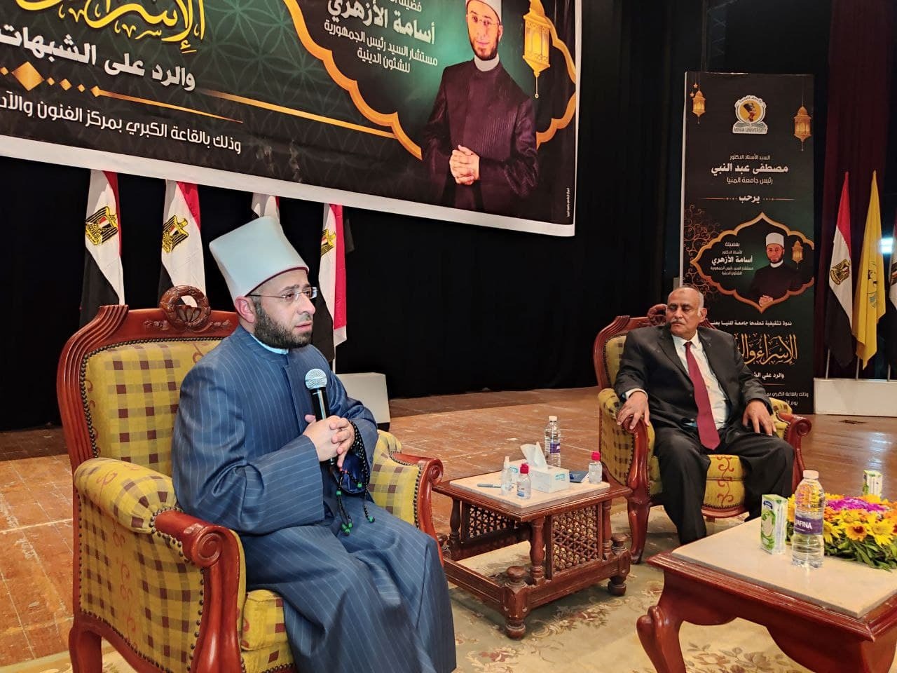 وفي بداية حديثه، قدم الدكتور أسامة الأزهري الشكر لمحافظ المنيا، ولجامعة المنيا على الدعوة الكريمة، ولكل إنسان كريم على أرض المحافظة الكريمة، كما قدم الشكر للطالب القارئ على تلاوته الكريمة قائلا: إنها كانت تلاوة صادقة لمست قلبي ووجداني ودليلًا على نموذج من المواهب الرفيعة لطلاب الجامعة.