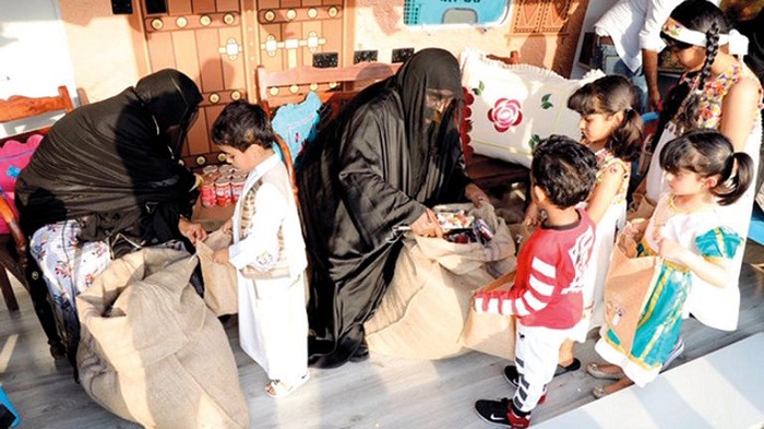 أما الصبيان يرتدوا الكندورة والطاقية المطرزة، حاملين أكياس مصنوعة من القماش تسمى الخرايط ليجمعوا الحلوى والمكسرات بها، منشدين أغنيتهم الخاصة التي توارثوها من أجدادهم "عطونا.. الله يعطيكم.. بيت مكة يوديكم"، وعند إعطاء أهل البيت لهم ما لذ وطاب من المسكرات يسيرون مبتهجين مغنيين "قدام بيتهم وادي.. والخير كله ينادي".