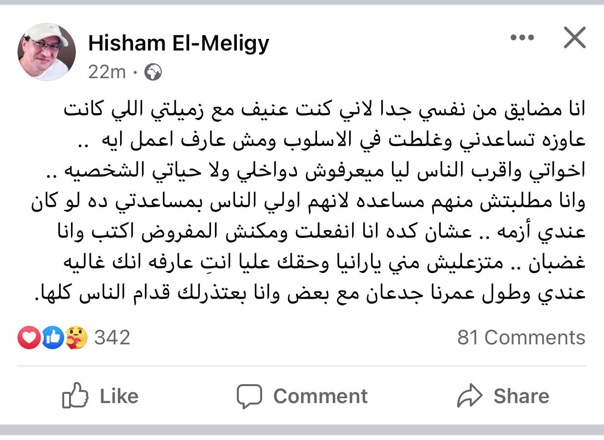 وفي سياق متصل، اعتذر هشام المليجي لـ رانيا شاهين، حيث كتب عبر حسابه بموقع التواصل الاجتماعي: أنا متضايق من نفسي جدًا، لأني كنت عنيف مع زميلتي، اللي كانت نيتها خير وعايزة تساعدني، وغلطت في الأسلوب، ومش عارف أعمل إيه.. أخواتي وأقرب الناس ليا ميعرفوش دواخلي، ولا حياتي الشخصية.