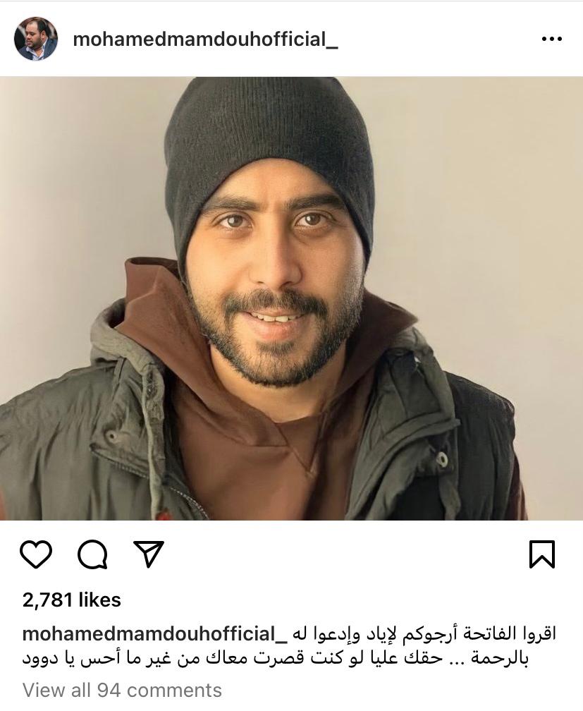 ونشر محمد ممدوح صورة إياد داوود عبر حسابه الرسمي على موقع تبادل الصور والفيديوهات القصيرة انستجرام، وعلق قائلا: اقروا الفاتحة أرجوكم لإياد وادعوا له بالرحمة.. حقك عليا لو كنت قصرت معاك من غير ما أحس يا داود.