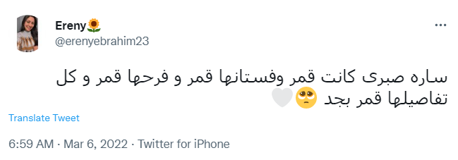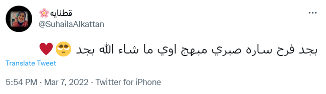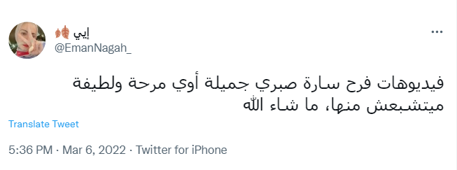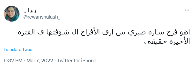 وقال حساب باسم قطناية: بجد فرح سارة صبري مبهج أو ي ما شاء الله بجد، بينما علقت روان: اهو فرح ساره صبري من أرق الأفراح ال شوفتها ف الفتره الأخيره حقيقي.