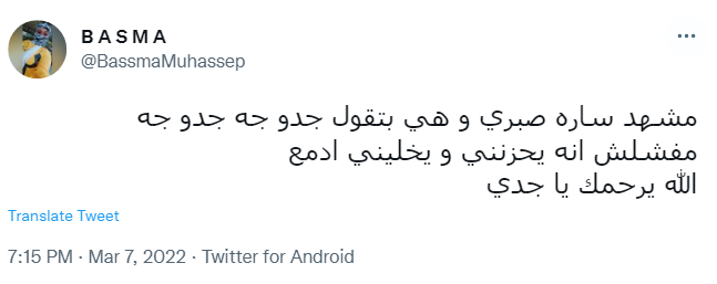 وكتبت بسمة: مشهد ساره صبري وهي بتقول جدو جه جدو جه، مفشلش إنه يحزنني ويخليني ادمع، الله يرحمك يا جدي، وعلق حساب آخر: سارة صبري عروسة زي القمر.