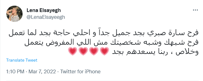 وقالت لينا: فرح سارة صبري بجد جميل جدًا وأحلى حاجة بجد لما تعمل فرح شبهك وشبه شخصيتك مش اللي المفروض يتعمل وخلاص، ربنا يسعدهم بجد.