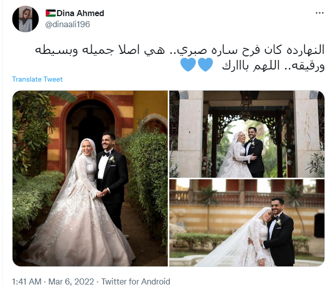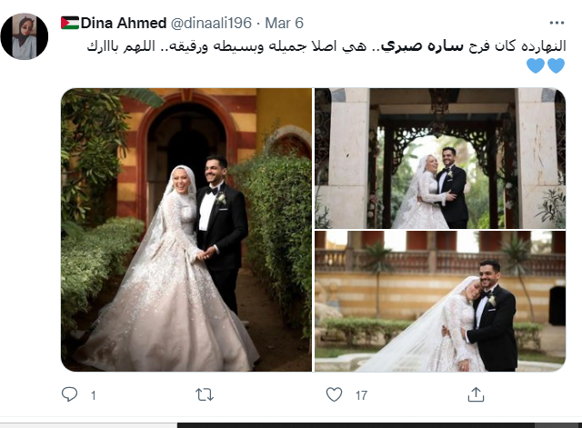 وقال حساب باسم دينا أحمد: النهارده كان فرح سارة صبري.. هي أصلا جميلة وبسيطة ورقيقة.. اللهم بارك.
