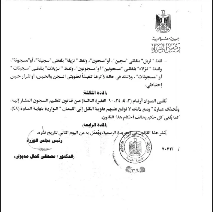 يأتي ذلك وفق تقرير لجنة الدفاع والأمن القومي، وبتعديل بعض أحكام القانون رقم 396 لسنة 1956، في شأن تنظيم السجون في إطار خطة الدولة لتطوير المؤسسات العقابية في مسمياتها، وابنيتها، وإدارتها على نحو يهدف إلى ترسيخ قيم ومبادئ حقوق السجناء، ويسعي إلى توفير الحماية المجتمعية لهم، وإصلاحهم وإدماجهم ضمن مكونات المجتمع الإنساني، والاستفادة من تأهيلهم في برامج وخطط التنمية للدولة.