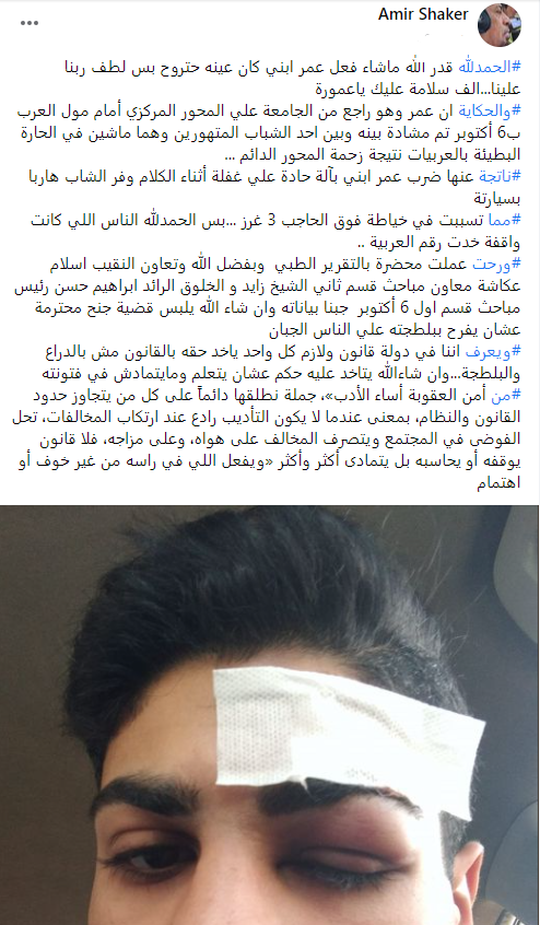 وكتب أمير شاكر منشورًا، عبر حسابه الشخصي بموقع التواصل الاجتماعي فيسبوك، قال فيه: الحمد لله قدر الله ما شاء فعل، عمر ابني كان عينه هتروح بس لطف ربنا علينا، ألف سلامة عليك يا عمورة، الحكاية أن عمر وهو راجع من الجامعة على المحور المركزي أمام مول العرب بـ 6 أكتوبر، تم مشادة بينه وبين أحد الشباب المتهورين، وهما ماشين في الحارة البطيئة بالعربيات، نتيجة زحمة المحور الدائم.