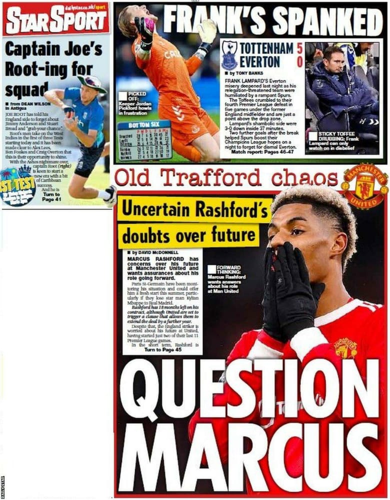 أشارت صحيفة تيليجراف في غلافها إلى غموض مستقبل ماركوس راشفورد مع مانشستر يونايتد، حيث قالت: راشفورد يرى مستقبله مع مانشستر يونايتد في حالة غموض.