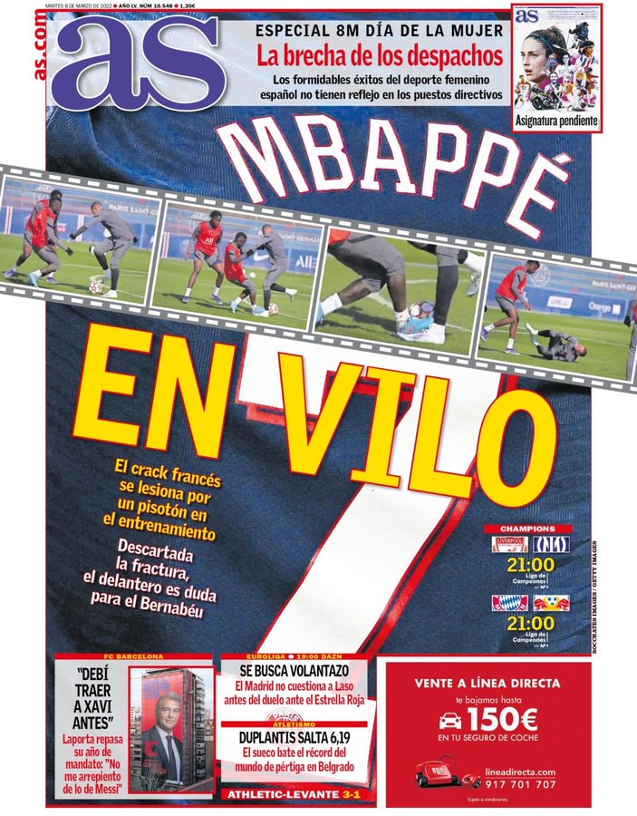 تصدر العنوان، مبابي يصاب بالدهس على قدمه أثناء التدريب، غلاف صحيفة آس لعدد اليوم، وذلك بعد تعرضه لضربة من إدريسا جاي ولكنه جاهز للمشاركة أمام ريال مدريد.