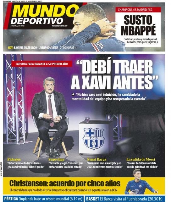 سلطت موندو ديبورتيفو الضوء على ندم لابورتا، على عدم التعاقد مع تشافي في وقت مبكر عن الوقت الحالي، حيث عنونت بـ كان يجب أن أحضر تشافي من قبل، وذلك كتصريح لرئيس النادي الكتالوني الذي أكد تغير الفريق مع تشافي.