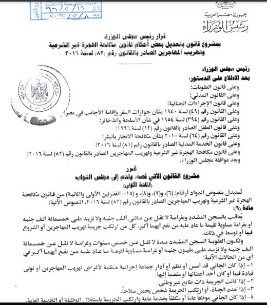 وجاءت التعديلات تماشيًا مع أبرز أهداف الاستراتيجية الوطنية لمكافحة الهجرة غير الشرعية 2016 - 2026، والتي تستهدف حماية الفئات الأكثر عرضة لخطر الاستغلال من جانب المهربين، وهم الشباب والأطفال وأسرهم والوافدين إلى مصر بشكل غير شرعي.