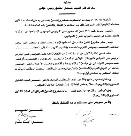 تقضي باستبدال نصوص المواد أرقام: 6، و7، و8، و15-الفقرتين الأولى والثانية، من قانون مكافحة الهجرة غير الشرعية وتهريب المهاجرين الصادر بالقانون رقم 82 لسنة 2016، حيث شدد التعديل المقترح العقوبتين المقيدة للحرية، والغرامة المقررتين بالمادتين 6، و15، بحديهما الأدنى والأقصى لتصبح في مادة 6 السجن المشدد والغرامة التي لا تقل عن مائتي ألف جنيه ولا تزيد عن خَمسمائة ألف جنيه، وبغرامة مساوية لقيمة ما عاد عليه من نفع أيهما أكبر كل من ارتكب جريمة تهريب المهاجرين أو الشروع فيها أو التوسط في هذا الجرم، والسجن المشدد مدة لا تقل عن خمس سنوات وغرامة لا تقل عن خمسمائة ألف جنيه ولا تزيد على مليون جنيه وغرامة مساوية لقيمة ما عاد عليه من نفع أيهما أكبر في الحالات الواردة بذات المادة.