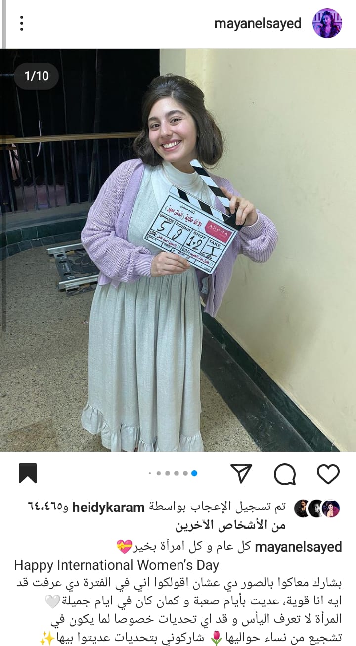 وشاركت الفنانة مايان السيد متابعيها، بصورة جديدة لها، من كواليس مسلسل إلا أنا، وعلقت عليها قائلة: كل عام وكل امرأة بخير، بشارك معاكم بالصورة دي عشان أقولكم أني في الفترة دي عرفت قد إيه أنا قوية، ومريت بأيام صعبة، وكمان في أيام جميلة، المرأة لا تعرف اليأس، وقد إيه تحديات خصوصًا، لما يكون في تشجيع من النساء حواليها شاركوني بتحديات عديتوا بيها.