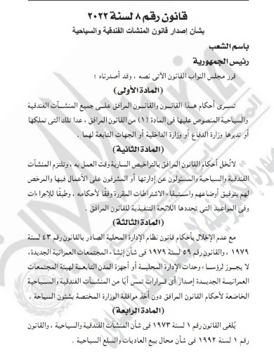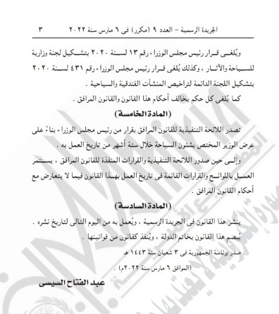 نشرت الجريدة الرسمية تصديق الرئيس عبد الفتاح السيسي، على القانون رقم 8 لسنة 2022 بشأن إصدار قانون المنشآت السياحية والفندقية، والذي وافق عليه مجلس النواب.