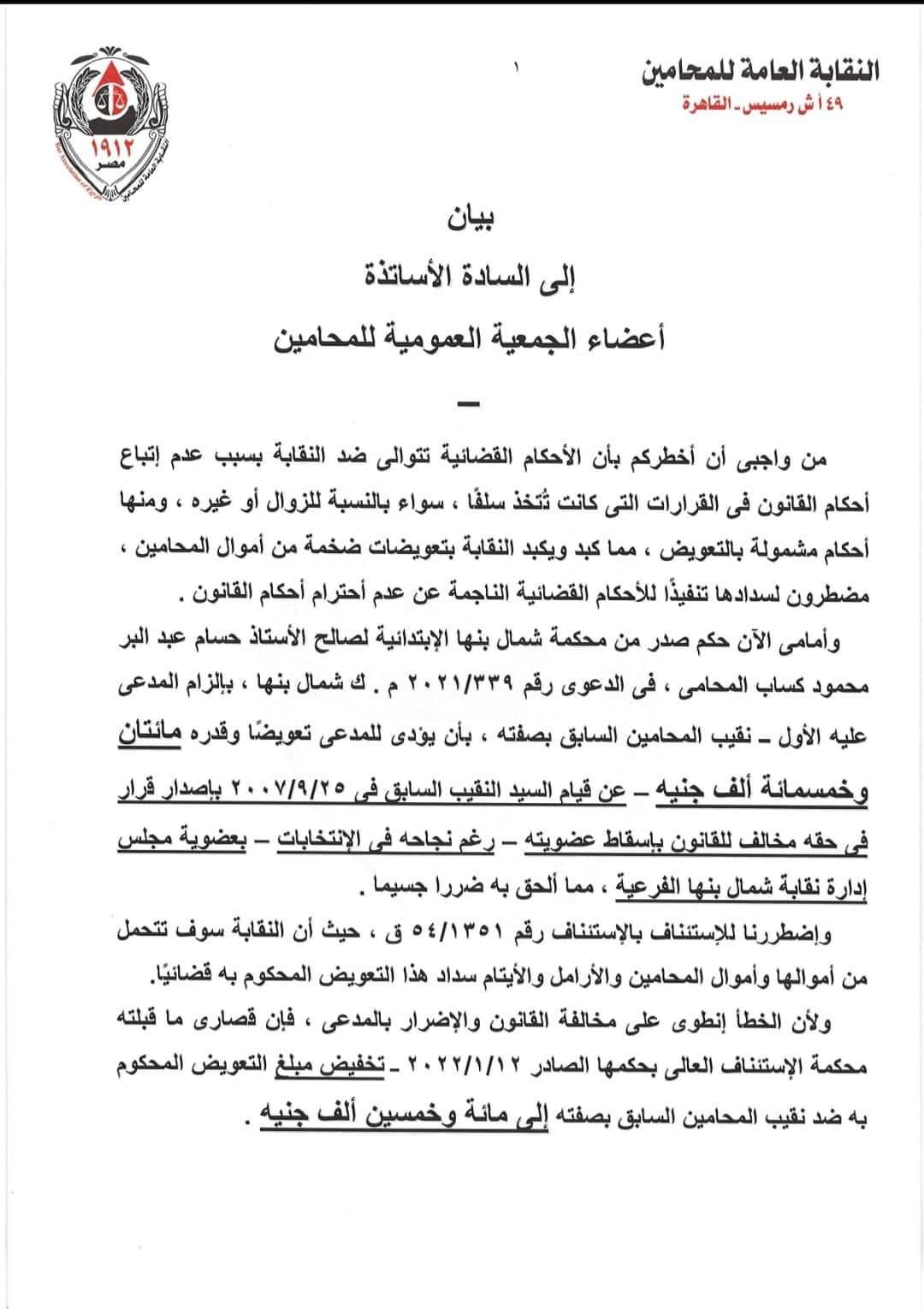 واستكمل: إن قصارى ما قبلته محكمة الاستئناف العالي بحكمها الصادر 12/1/2022 تخفيض مبلغ التعويض المحكوم به ضد نقيب المحامين السابق بصفته إلى مائة وخمسين ألف جنيه، لافتًا إلى أن النقابة وأموال المحامين واليتامى والأرامل هي التي تتكبد هذا التعويض وغيره من التعويضات المحكوم بإلزامها بها، نتيجة التعالي والإصرار بغير حق على مخالفة القانون، وفي نقابة واجبها أن تحترم القانون وأن تدافع عنه.