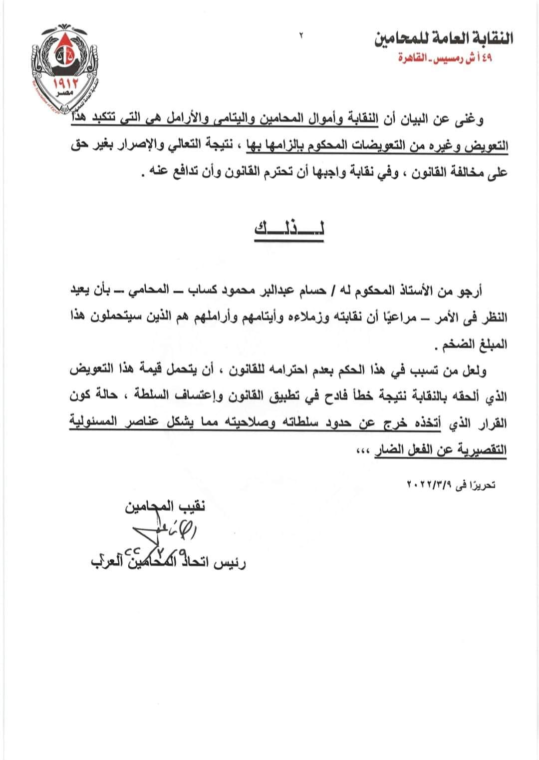وواصل: نرجو من المحكوم له حسام عبد البر محمود كساب المحامي بأن يعيد النظر في الأمر مراعيًا أن نقابته وزملائه وأيتامهم وأراملهم هم الذين سيتحملون هذا المبلغ الضخم.