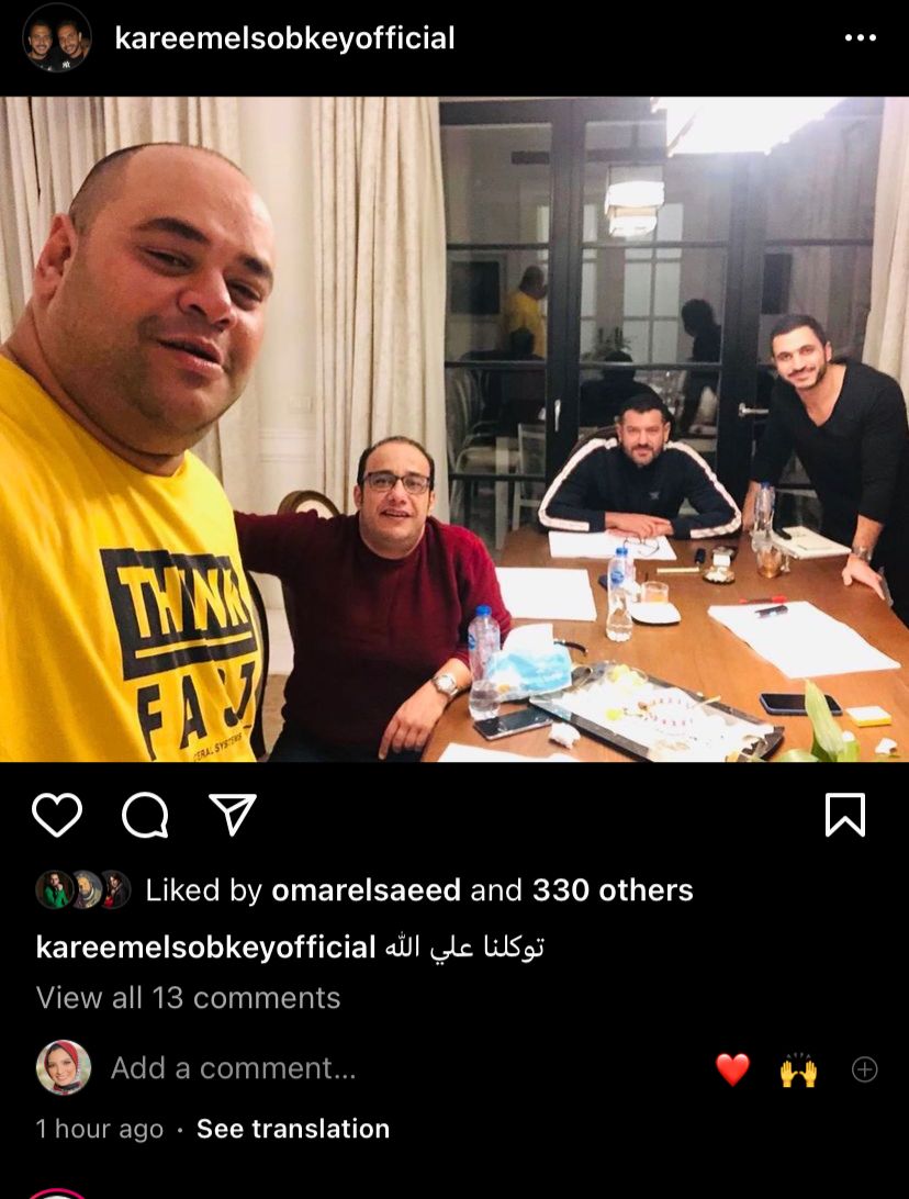 ونشر كريم السبكي، صورة تجمعه مع كل محمد ممدوح وعمرو يوسف، عبر حسابه الشخصي بموقع انستجرام، وعلق قائلًا: توكلنا على الله.