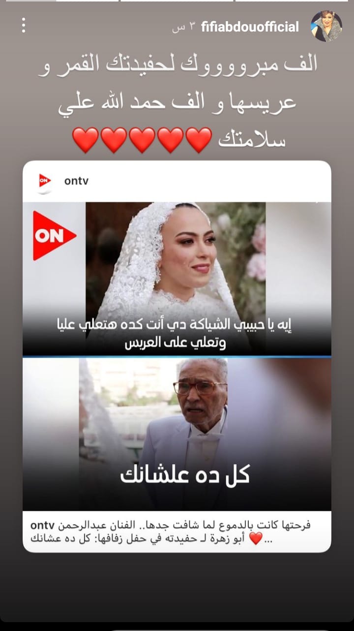وشاركت فيفي عبده صورًا لـ عبد الرحمن أبو زهرة، من حفل زفاف حفيدته، بالإضافة إلى صورة لحفيدته، عبر حسابها الشخصي بموقع انستجرام، وعلقت عليها: ألف مبروك لحفيديك القمر وعريسها، وألف حمد الله على سلامتك.