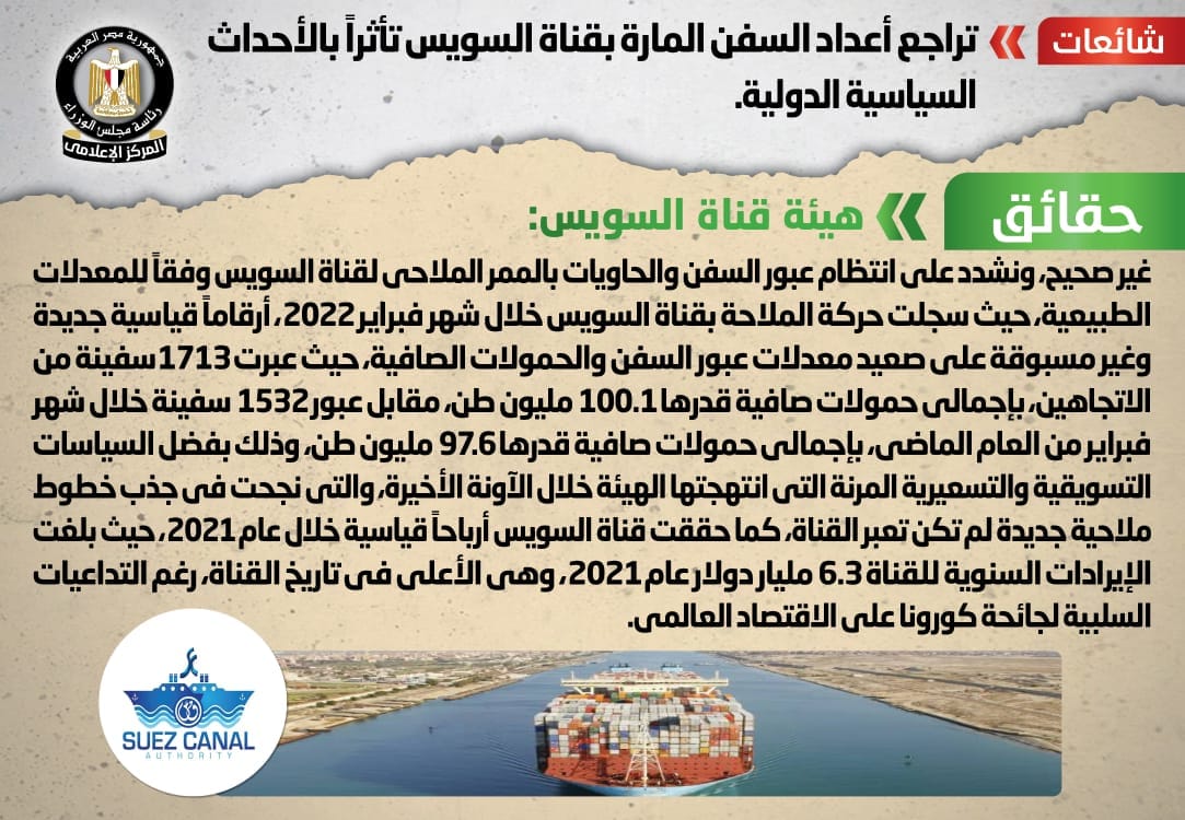 وتواصل المركز الإعلامي لمجلس الوزراء، مع هيئة قناة السويس، والتي نفت تلك الأنباء، مُؤكدةً أنه لا صحة لتراجع أعداد السفن المارة بقناة السويس، مُشددةً على انتظام عبور السفن والحاويات بالممر الملاحي لقناة السويس، وفقًا للمعدلات الطبيعية.