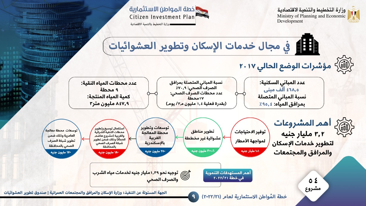 وتبلغ استثمارات قطاع الإسكان وتطوير العشوائيات 3،2 مليار جنيه بنسبة 12.3%، ويخص قطاع التعليم العالي والبحث العلمي 2،95 مليار جنيه بنسبة11.3 %، وقطاع التنمية المحلية 1.25 مليار جنيه بنسبة 4.8%، أما القطاعات الأخرى فيخصها استثمارات بقيمة 2.3 مليار جنيه بنسبة 8.8%.