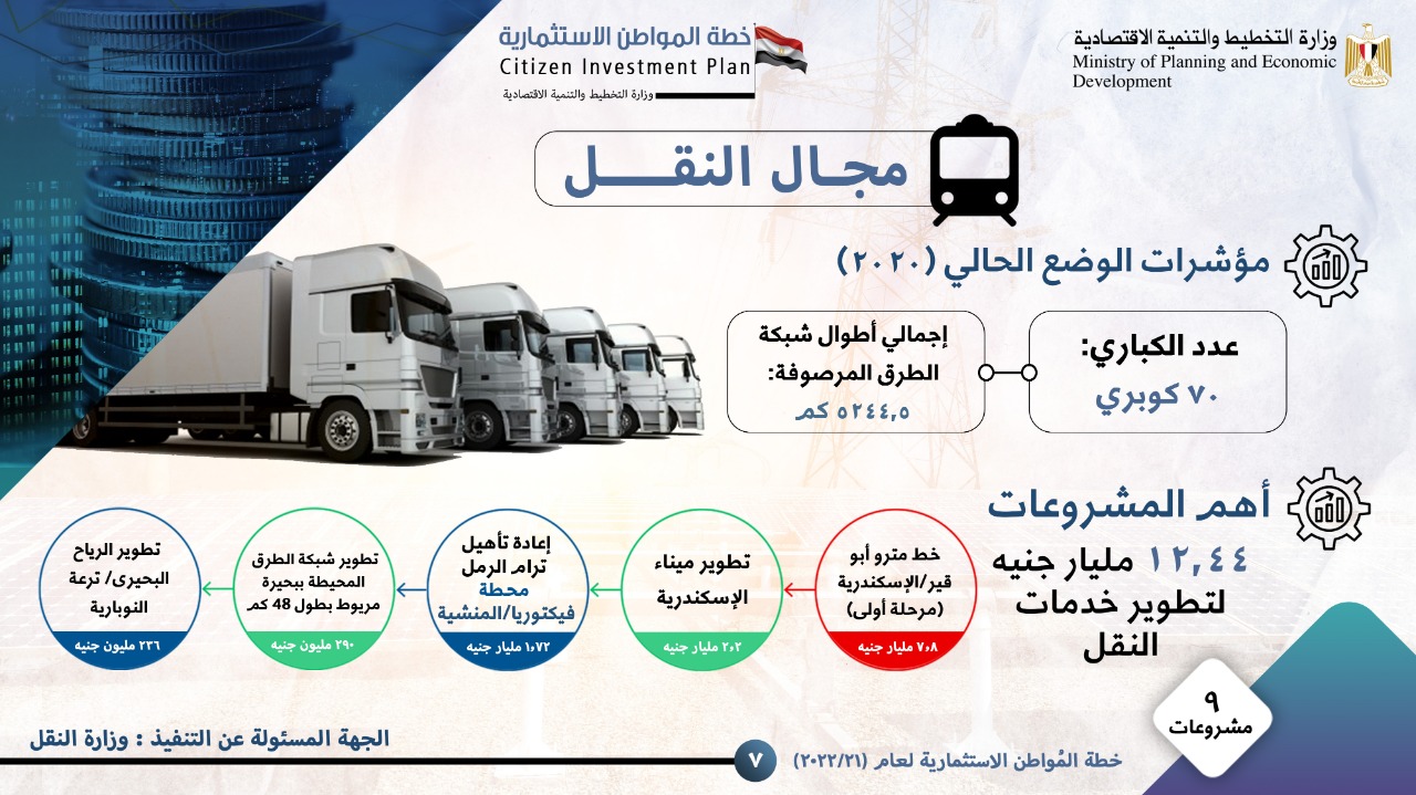 وفيما يتعلق بالتوزيع القطاعي للاستثمارات العامة المستهدفة بمحافظة الإسكندرية بخطة عام 21/2022 أشار تقرير وزارة التخطيط والتنمية الاقتصادية إلى توجيه استثمارات بقيمة 12.44 مليار جنيه لقطاع النقل بنسبة 47.8%، يليه قطاع البترول بقيمة 3.9 مليار جنيه بنسبة 15%.