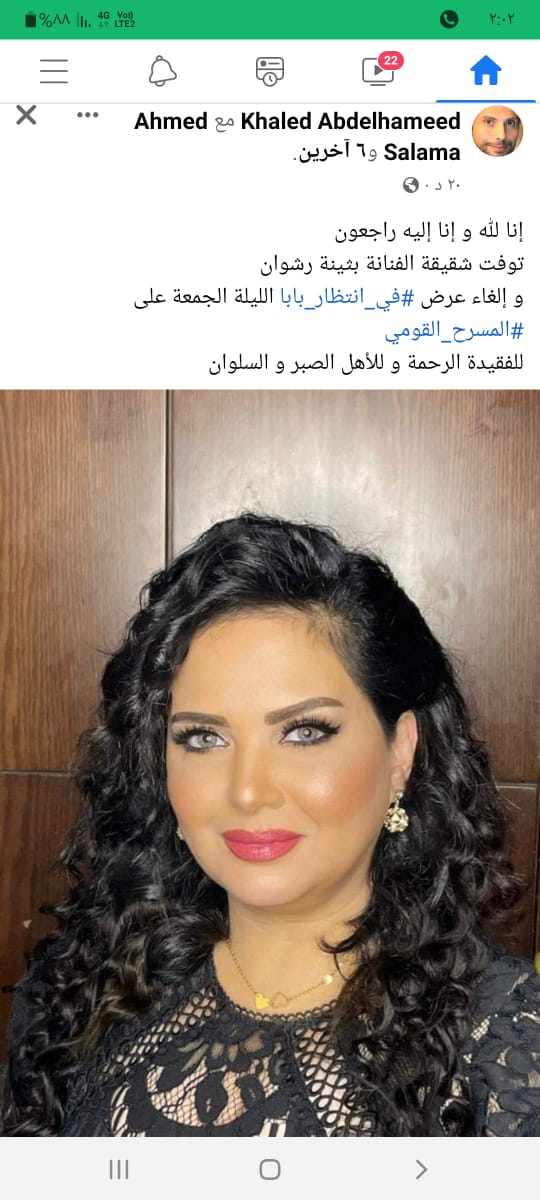وكتب الفنان خالد عبد الحميد، منشورًا، عبر حسابه على فيسبوك، نعى خلاله شقيقة الفنانة بثينة رشوان، حيث كتب: إنا لله وإنا إليه راجعون.. توفيت شقيقة الفنانة بثينة رشوان، وإلغاء عرض مسرحية في انتظار بابا، الليلة، الجمعة، على المسرح القومي.. للفقيدة الرحمة، وللأهل الصبر والسلوان.