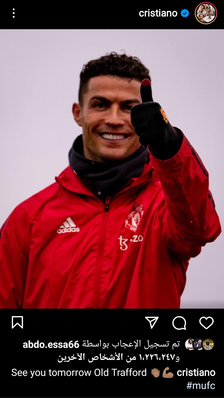 ونشر كرستيانو رونالدو على حسابه الرسمي على موقع التواصل الاجتماعي انستجرام، صورة له وعلق عليها: أراكم غدًا في أولد ترافورد.