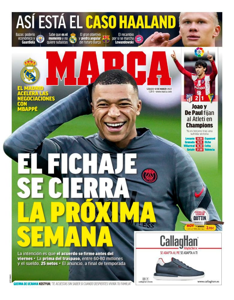 عنونت ماركا في غلافها بـ التوقيع يُغلق الأسبوع المقبل، وذلك في إشارة بأن ريال مدريد أنهى اتفاقه مع مبابي لضمه في الصيف.