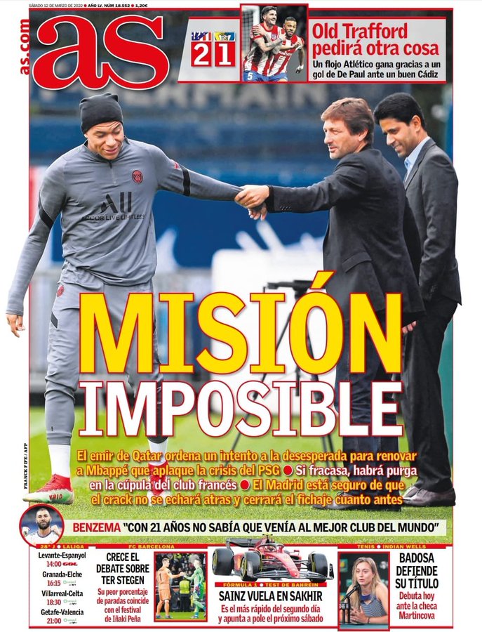 تصدر العنوان، محاولة يائسة، غلاف صحيفة آس لعدد اليوم، وذلك بعد أن قالت: أمير قطر يأمر بمحاولة يائسة لتجديد مبابي لتهدئة أزمة باريس سان جيرمان إذا فشل سيكون هناك تطهير في قمة النادي الفرنسي، ومن المؤكد أنه لن يتراجع وسيغلق التوقيع في أقرب وقت.
