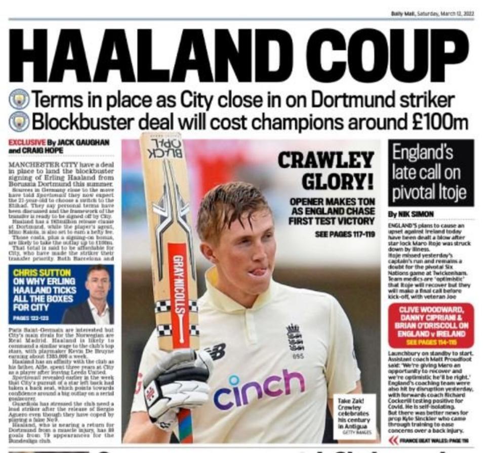 سلطت الصحيفة الضوء في غلافها، على مستقبل هالاند في الفترة المقبلة، وذلك بعد أن عنونت بـ مانشستر سيتي يتفق مع هالاند على الشروط الشخصية.