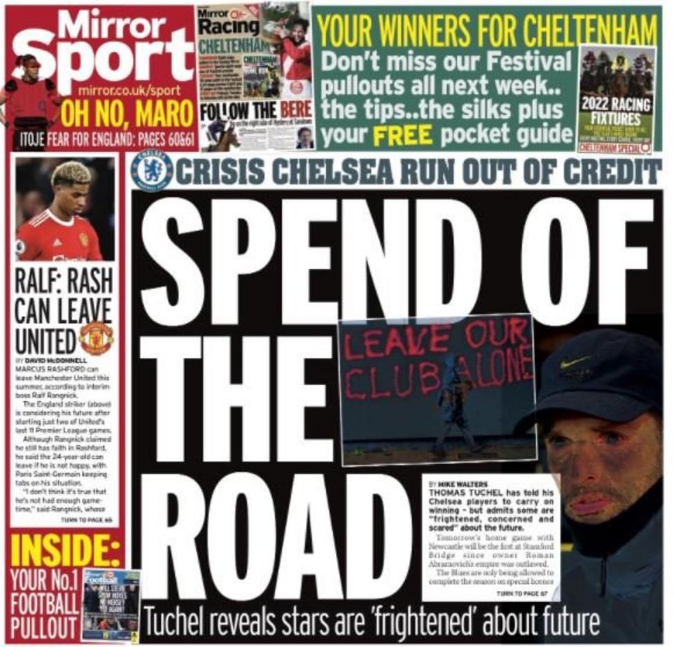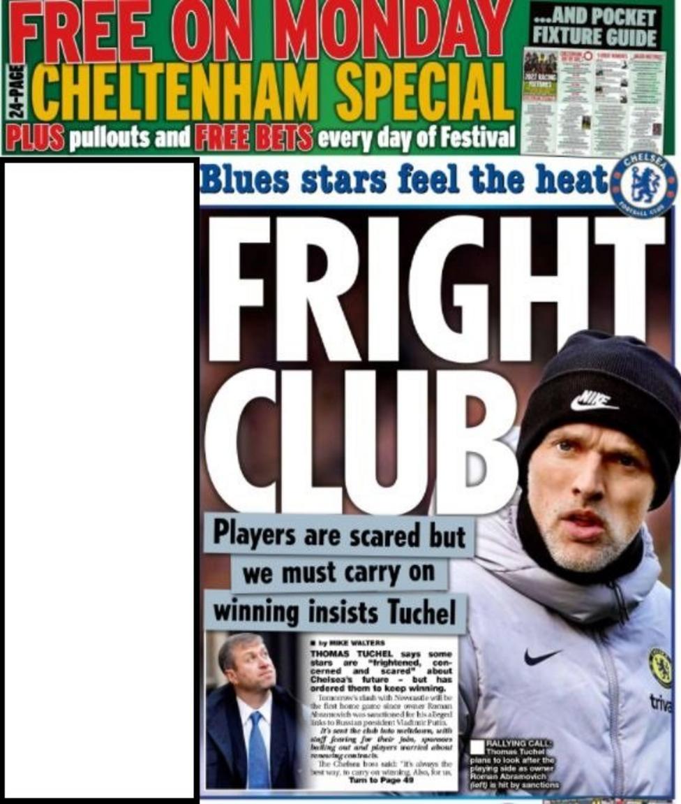 تصدر العنوان، رعب في تشيلسي غلاف ديلي ستار لعدد اليوم، بعد أن أشارت الصحيفة إلى حالة القلق التي يعيشها اللاعبون لغموض مستقبلهم، وكذلك موقف توخيل داخل غرف الملابس للتركيز على الفوز فقط.