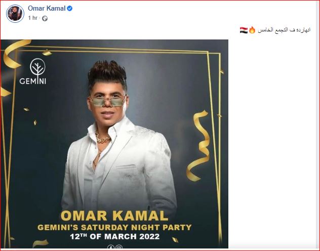 ونشر عمر كمال البوستر الدعائي للحفل عبر حسابه الشخصي بموقع فيس بوك معلق عليه: النهاردة في التجمع الخامس.