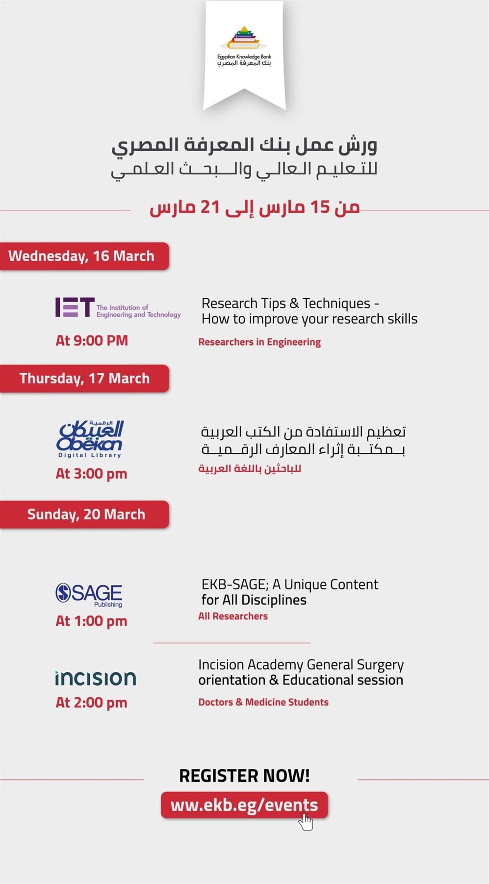 يعقد بنك المعرفة المصري سلسلة ورش تعليمية وبحثية جديدة للراغبين في التعرف على أدوات ومعايير البحث العلمي الصحيحة وكيفية الاستفادة من الموارد البحثية المختلفة.