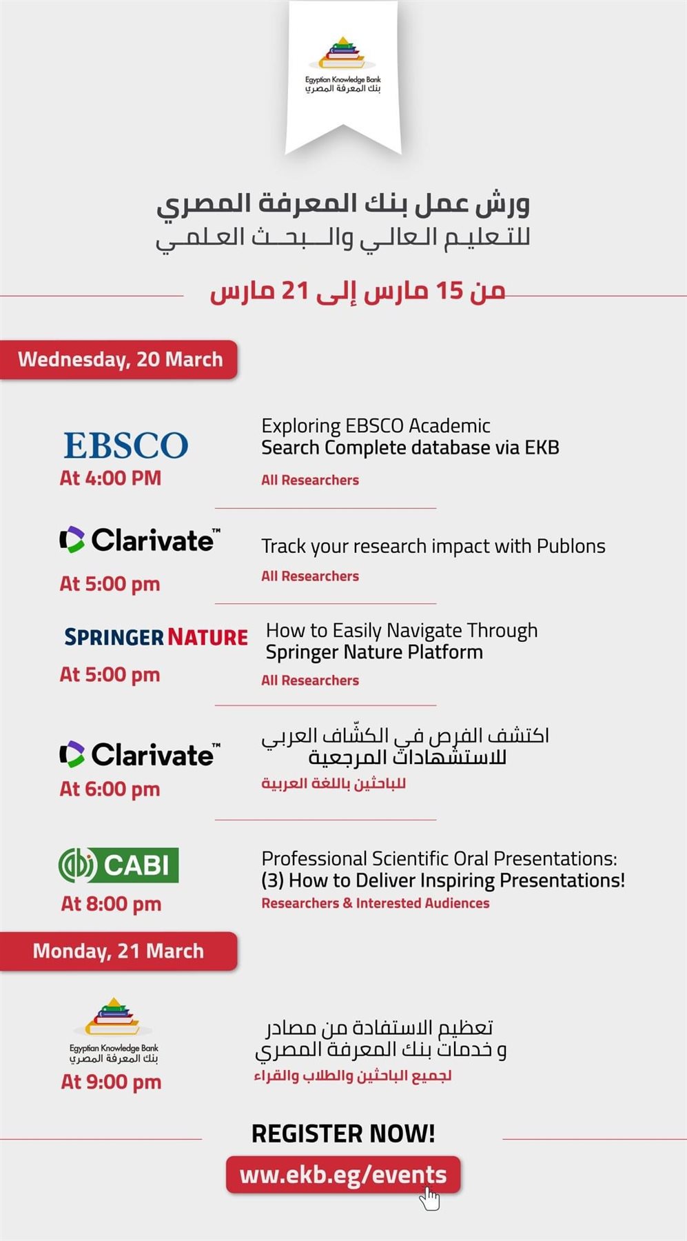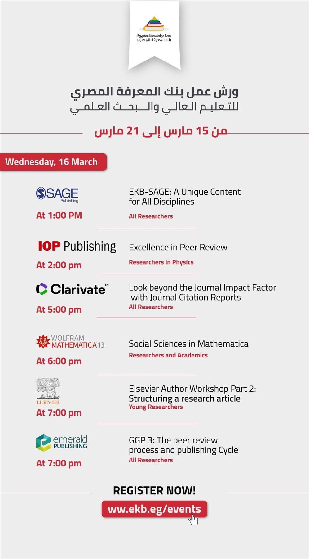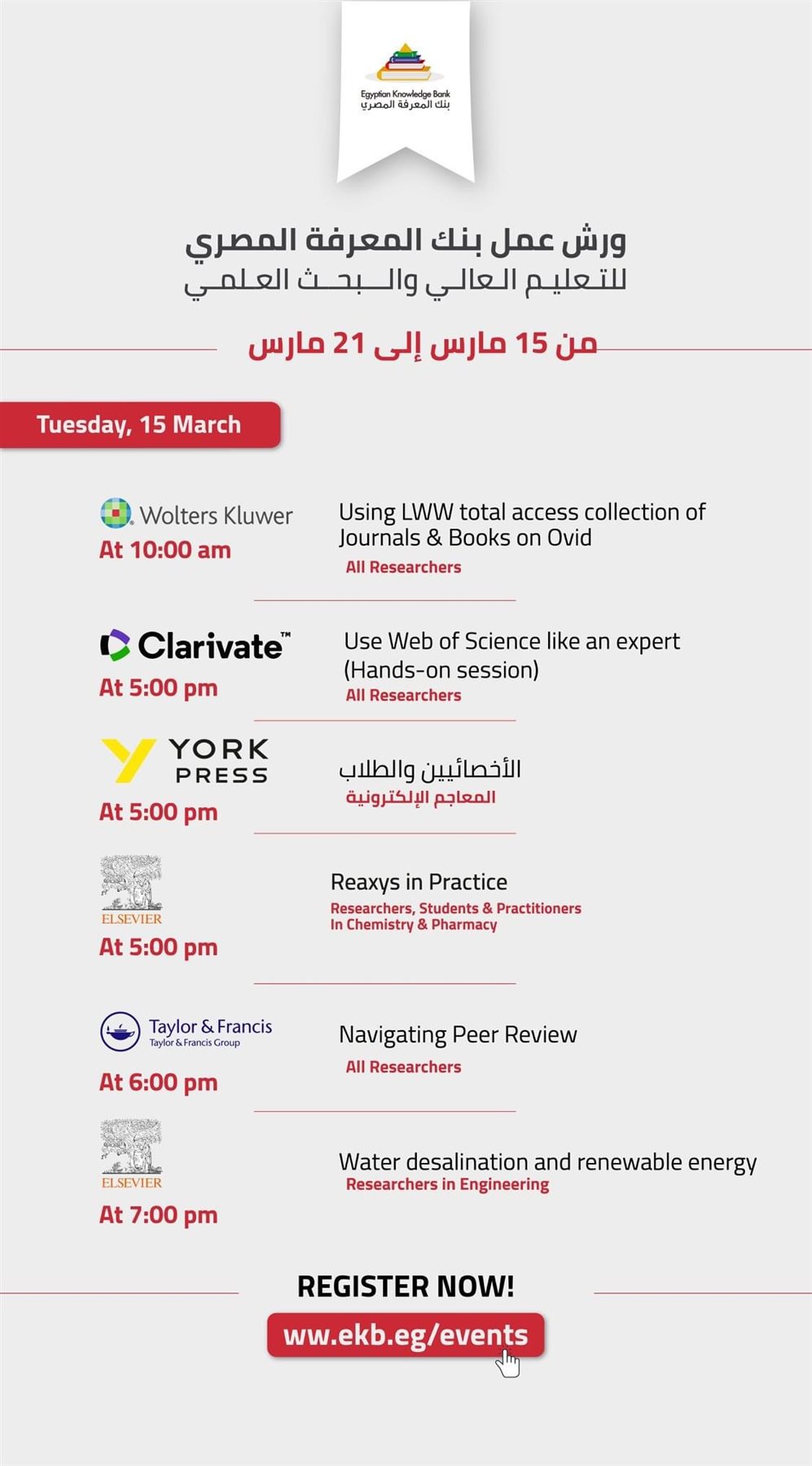 ونشر بنك المعرفة المصري، جدول ورش العمل بداية من 15 مارس حتى 21 مارس الجاري، عبر صفحتها على موقع التواصل الاجتماعي فيس بوك، حيث يمكن التسجيل من خلال صفحة الفيس بوك الخاصة بالبنك لحضور كل ورشة على حدة.