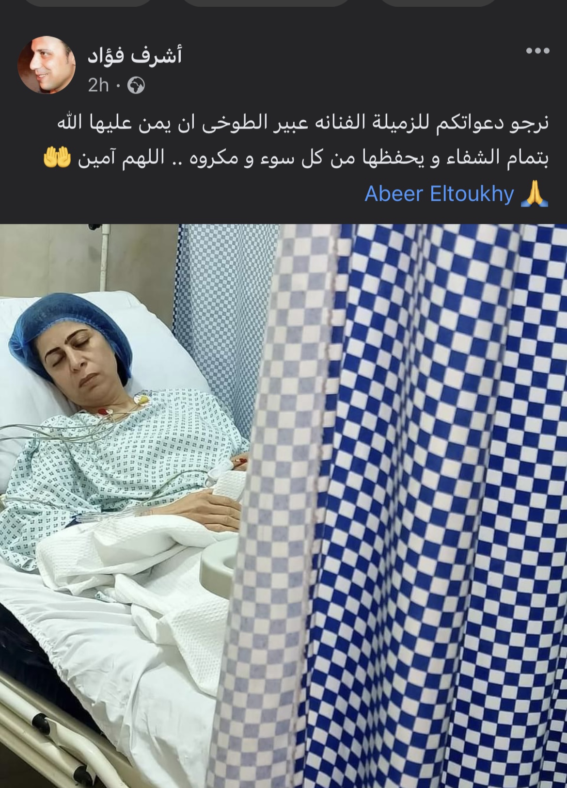 وكتب فؤاد عبر حسابه الشخصي بـ فيسبوك: نرجو دعواتكم للزميلة الفنانه عبير الطوخي، أن يمّن عليها الله بتمام الشفاء، ويحفظها من كل سوء ومكروه.. اللهم آمين.
