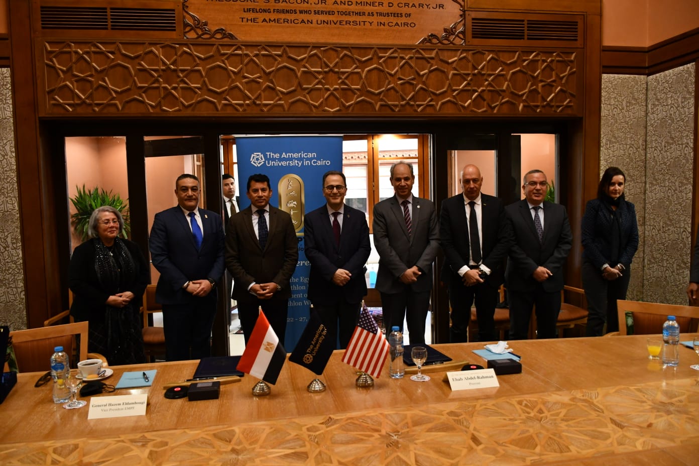 ووقع البروتوكول اللواء حازم الدمهوجي نائب رئيس الاتحاد المصري للخماسي الحديث، وممثلا عن الاتحاد، والأستاذ إيهاب عبد الرحمن ممثلا عن الجامعة الأمريكية بالقاهرة.