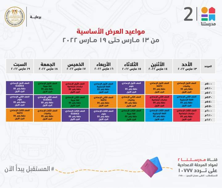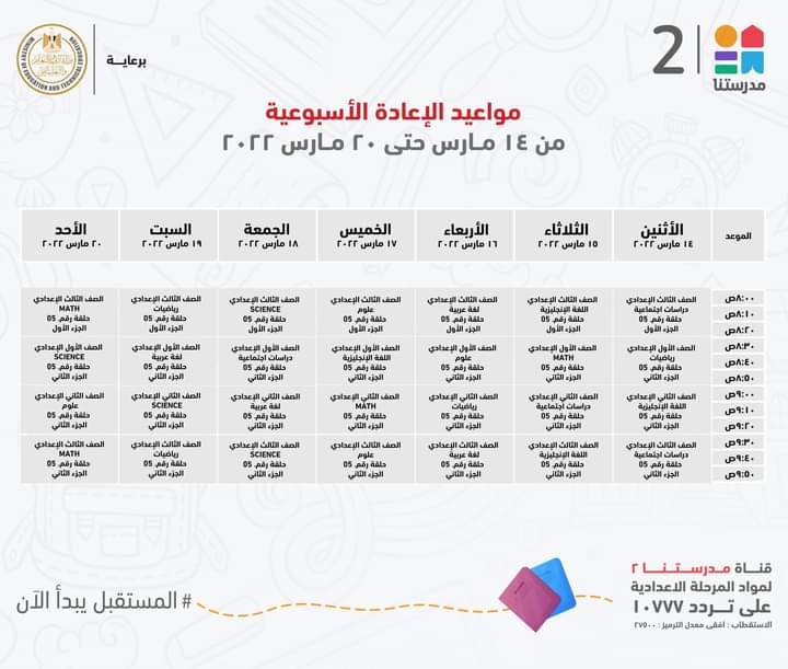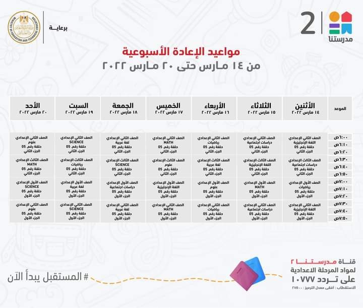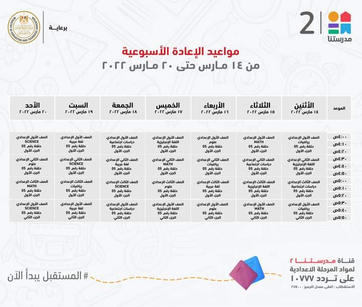أعلنت وزارة التربية والتعليم والتعليم الفني، جدول مواعيد عرض البرامج التعليمية، للمناهج الدراسية المقررة على جميع طلاب المرحلة الإعدادية، والتي من المقرر بثها على قناة مدرستنا 2.