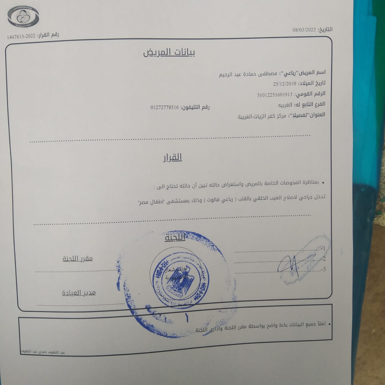وكان المواطن حمادة عبدالرحيم حمد، أرسل عدة استغاثات لإجراء عملية في القلب لابنه، لافتًا أن الطفل يعيش مأساة كبيرة منذ فترة؛ بسبب معاناة طفله المرضية.