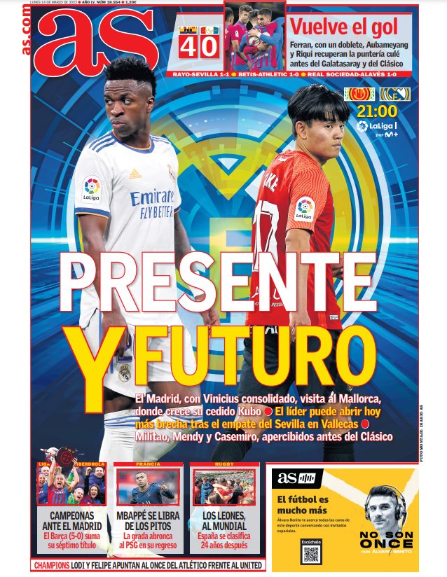 تصدر العنوان الحاضر والمُستقبل غلاف صحيفة آس الإسبانية لعدد اليوم، حيث قالت: مدريد مع توحيد فينيسيوس، يزور مايوركا، حيث ينمو لاعبه المُعار كوبو.