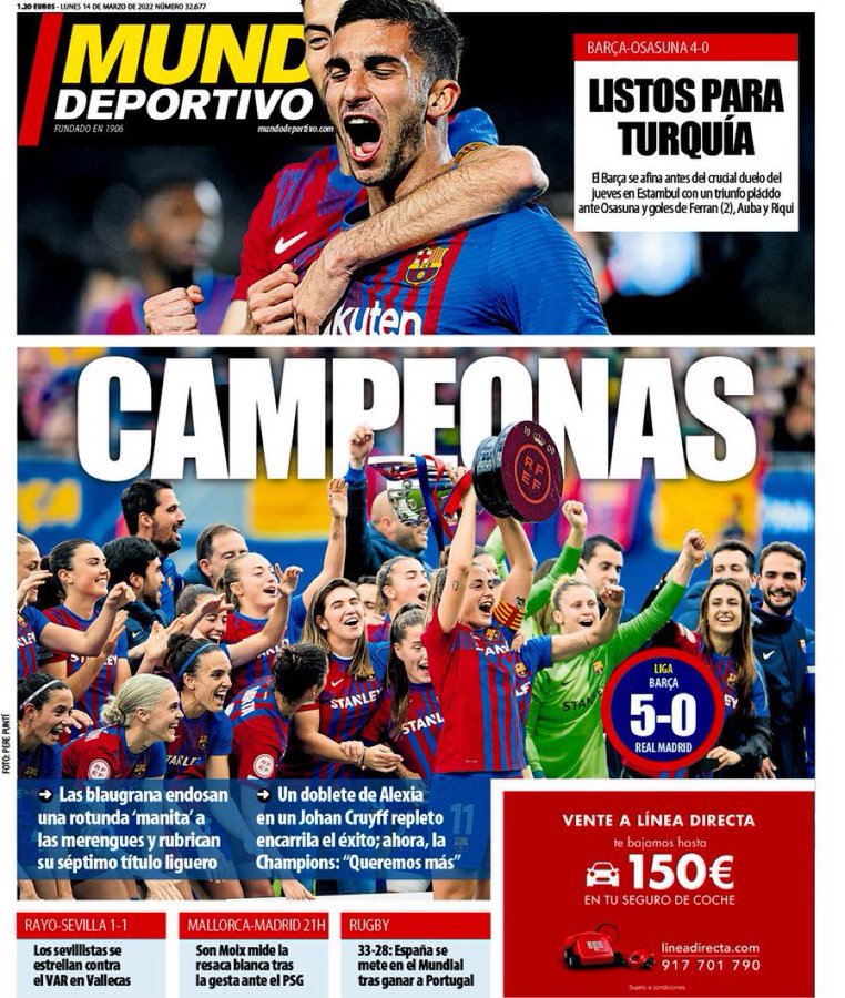تصدر العنوان بروفة الجاهزية لتركيا غلاف صحيفة موندو ديبورتيفو، حيث قالت الصحيفة: برشلونة يستعد قبل المباراة الحاسمة يوم الخميس في إسطنبول بفوز هادئ على أوساسونا بهدفين من فيران وهدف من أوبا وريكي.
