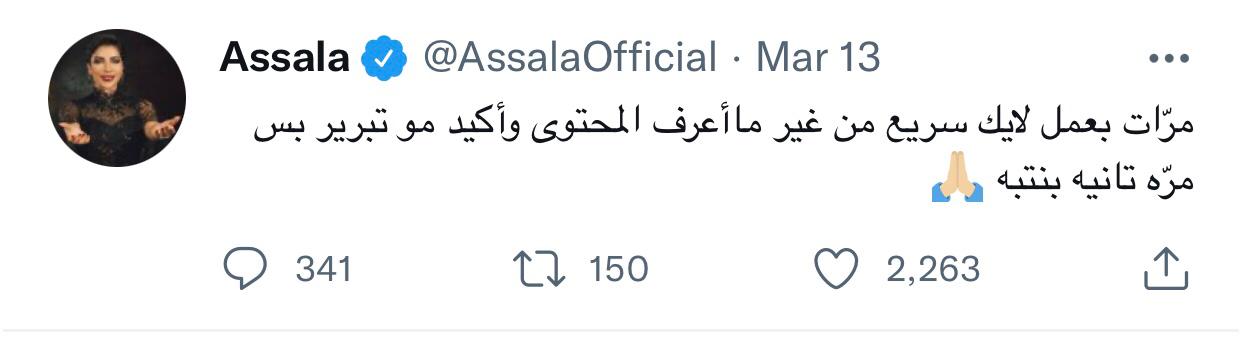 وحاولت أصالة إصلاح الأمر، واعتذرت لجمهورها عبر تغريدة بموقع تويتر، قائلة: أحيانا بعمل لايك بسرعة دون ما أعرف محتوى التغريدة، ولا يعتبر ذلك تبريرا عما فعلت، ولكني لن أكررها مرة أخرى.