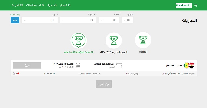 3- ثم اضغط على أيقونة: التصفيات المؤهلة لكأس العالم، لتجد مباراة مصر والسنغال، لكن الحجز غير متاحا الآن.