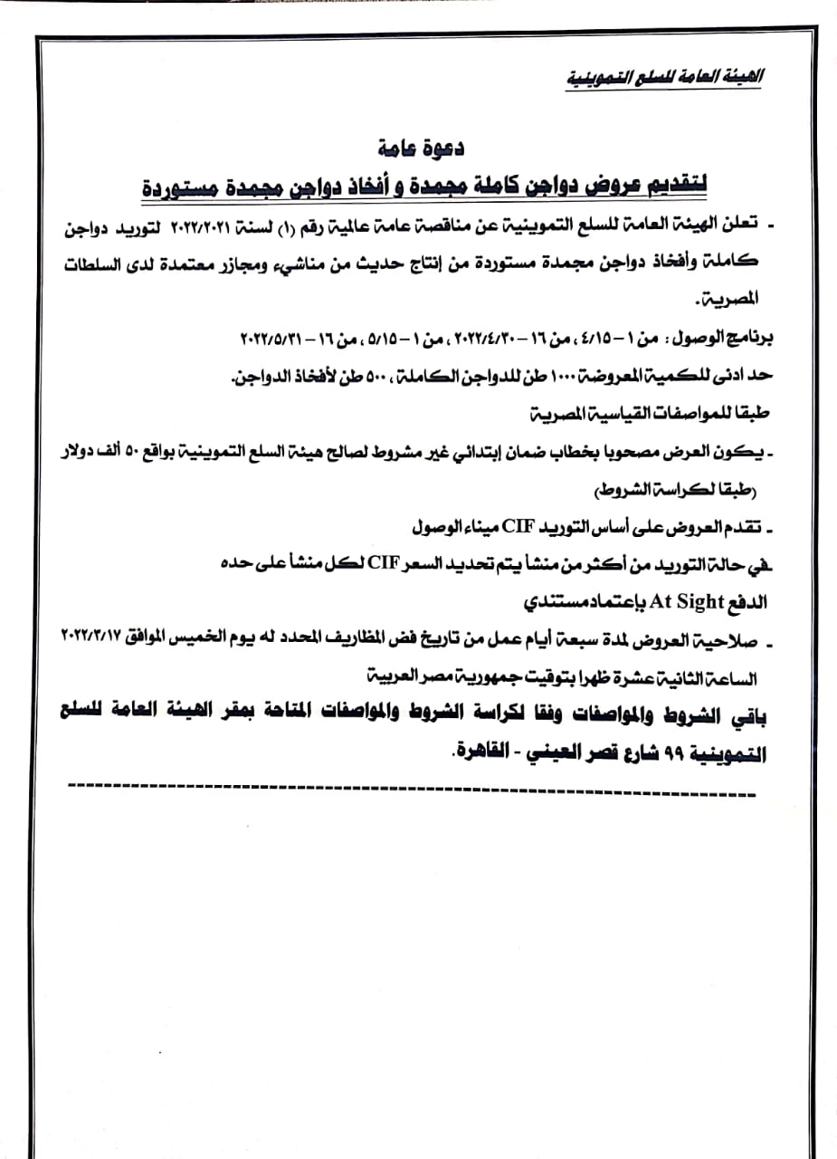 أعلنت منذ قليل، الهيئة العامة للسلع التموينية عن مناقصة عامة عالمية لتوريد دواجن كاملة وأفخاذ دواجن مجمدة مستوردة، من إنتاج حديث من مناشئ ومجازر معتمدة لدى السلطات المصرية.