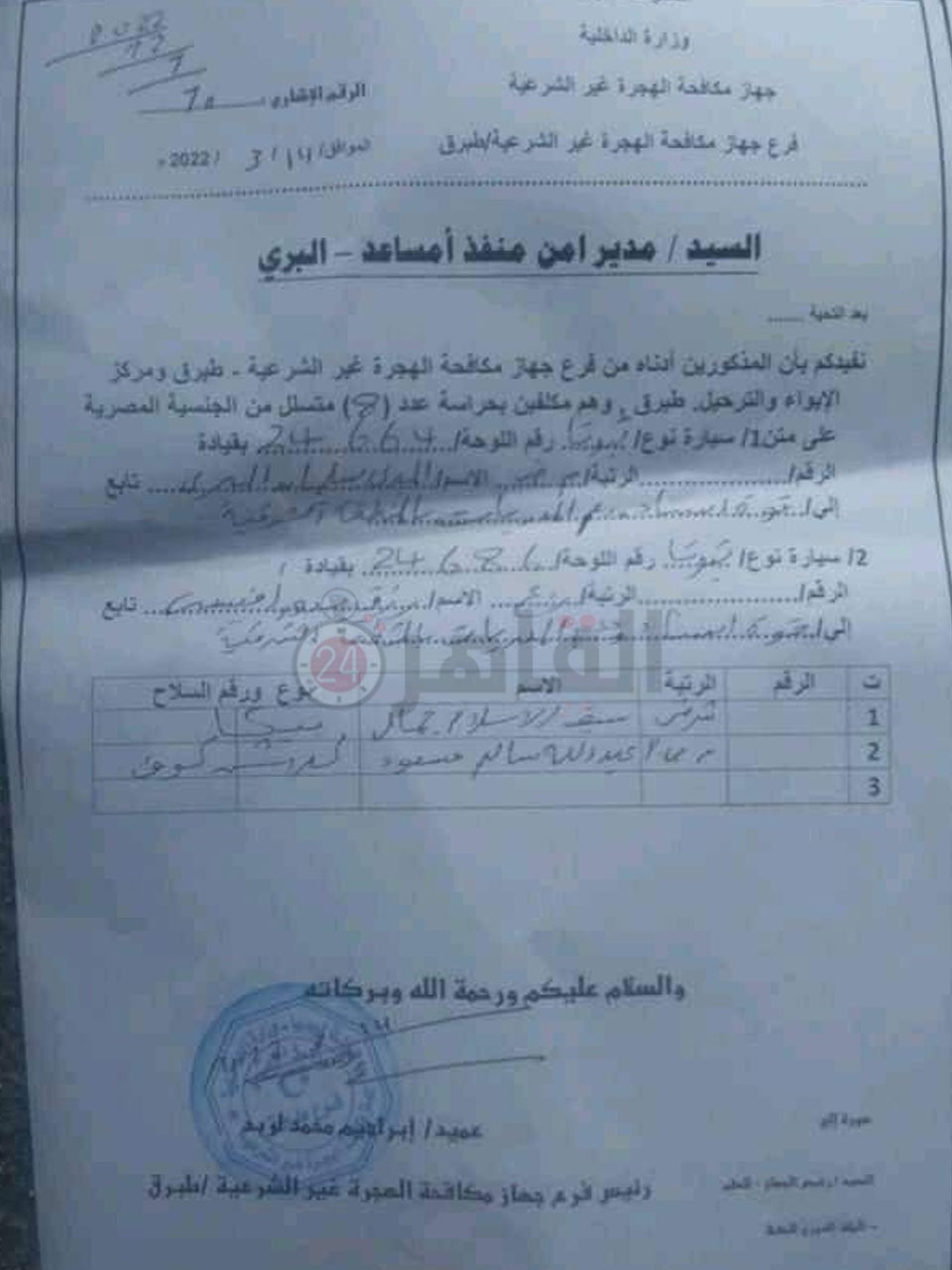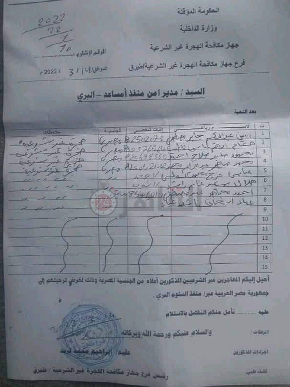 وحصل القاهرة 24 على نسخة من المستند الرسمي الذي يتضمن أسماء المهاجرين غير الشرعيين، وجاءت الأسماء كالتالي:-