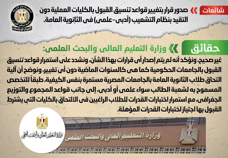 وتواصل المركز الإعلامي لمجلس الوزراء مع وزارة التعليم العالي والبحث العلمي، والتي نفت تلك الأنباء، مُؤكدةً أنه لا صحة لتغيير قواعد تنسيق القبول بالكليات العملية دون التقيد بنظام التشعيب (أدبي – علمي) في الثانوية العامة، وأنه لم يتم إصدار أي قرارات بهذا الشأن.